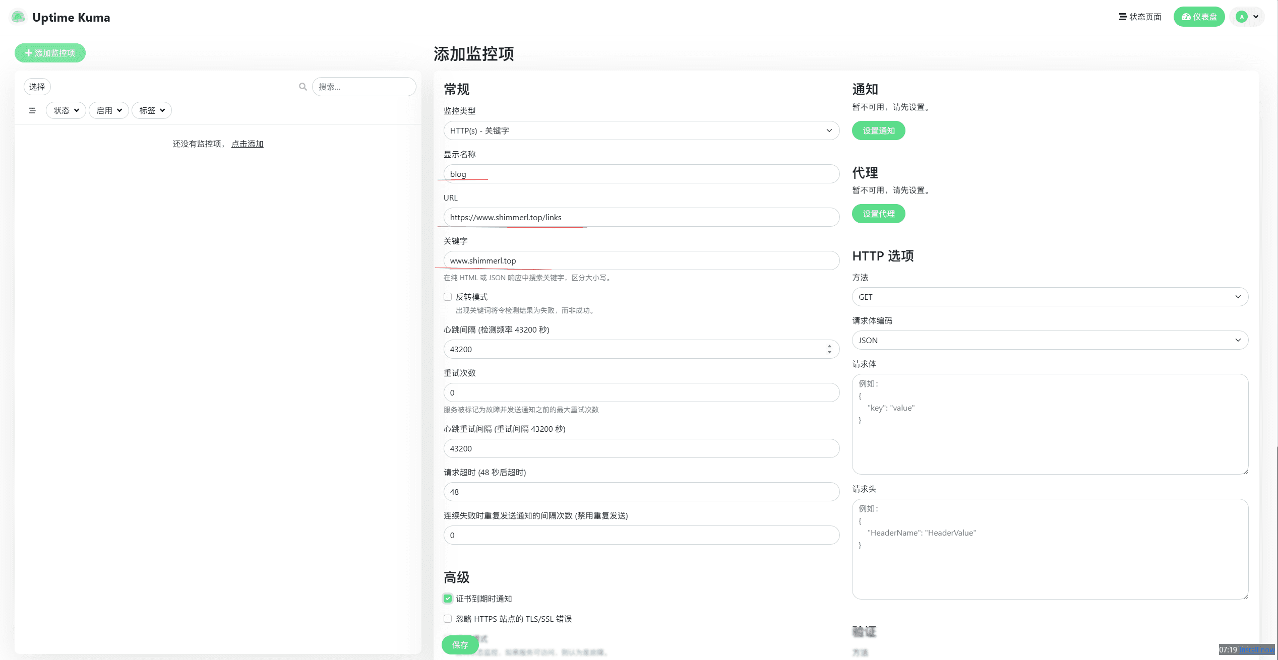 我们点击左上角的 添加控制项 ;监控类型选择HTTP(s)-关键字,名称输入友链的站名,URL输入对方的友链页面的URL;关键字可以是你网站的域名也可以是你网站的名字,心跳间隔我这里设置的是 86400秒 然后保存,程序就会每天都检测一次对方的友链状态以及Blog是否可以访问了。